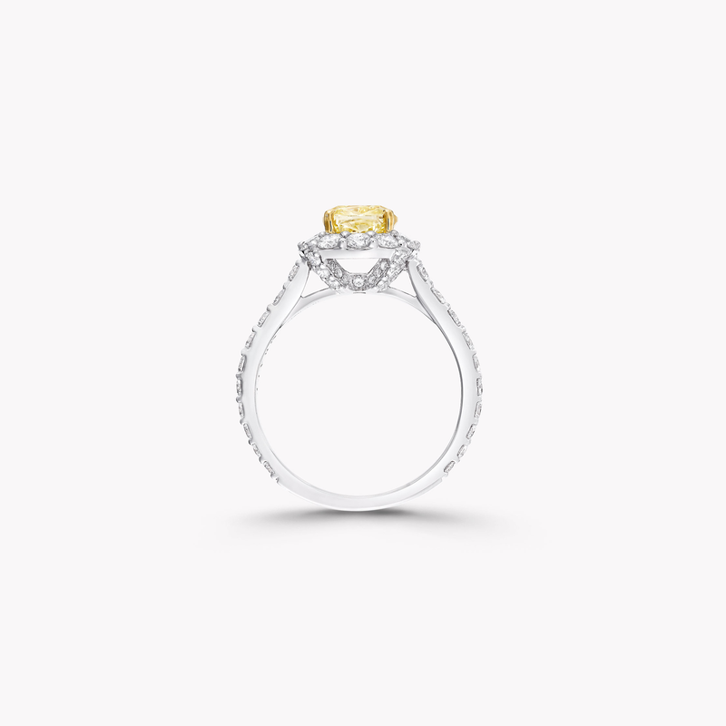 模特佩戴一枚迷人的Icon枕形切割黄钻和密镶白钻戒指,钻石共重2.93克拉,包括一颗经鉴定的1.51克拉枕形切割彩黄钻石。