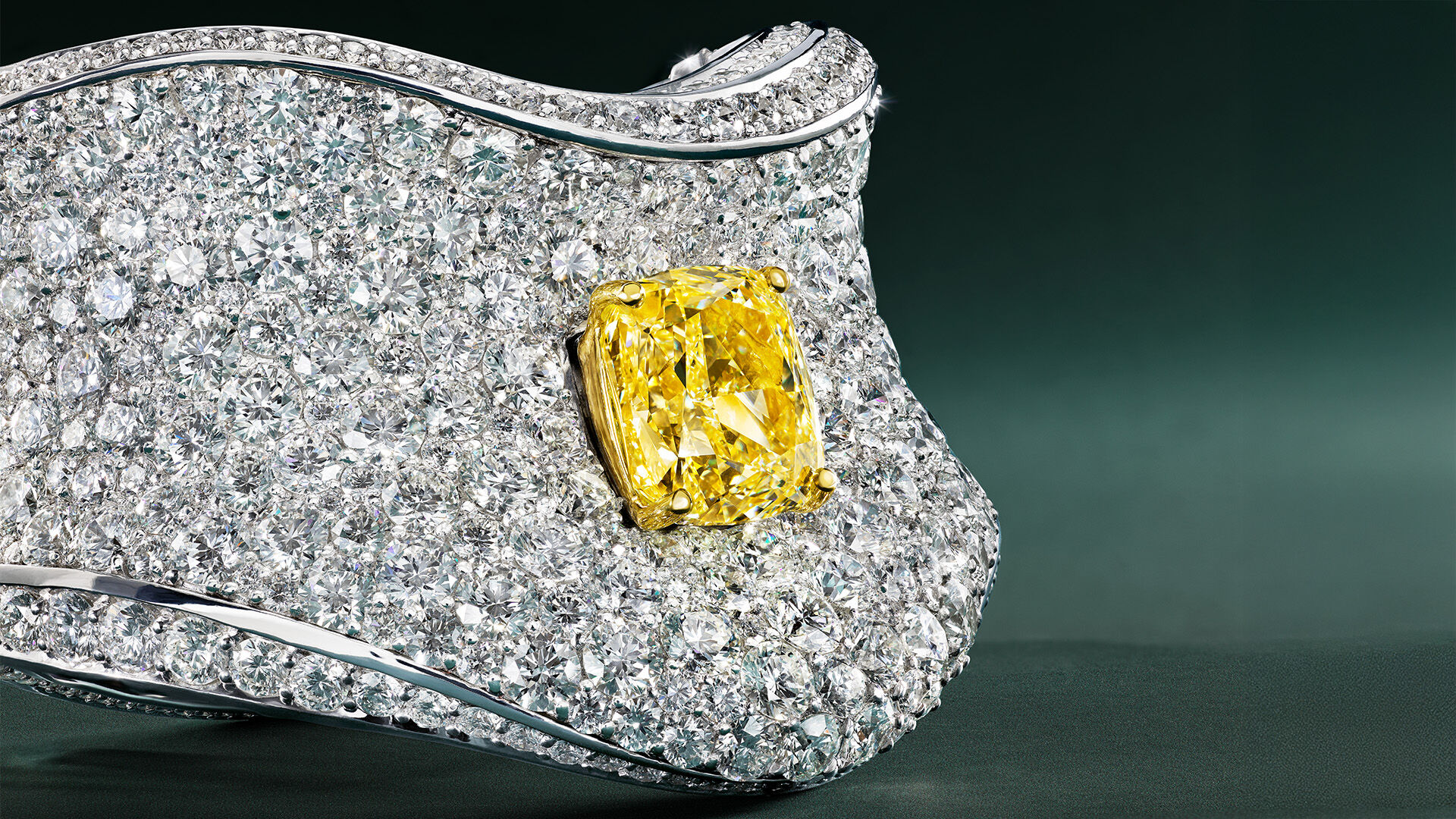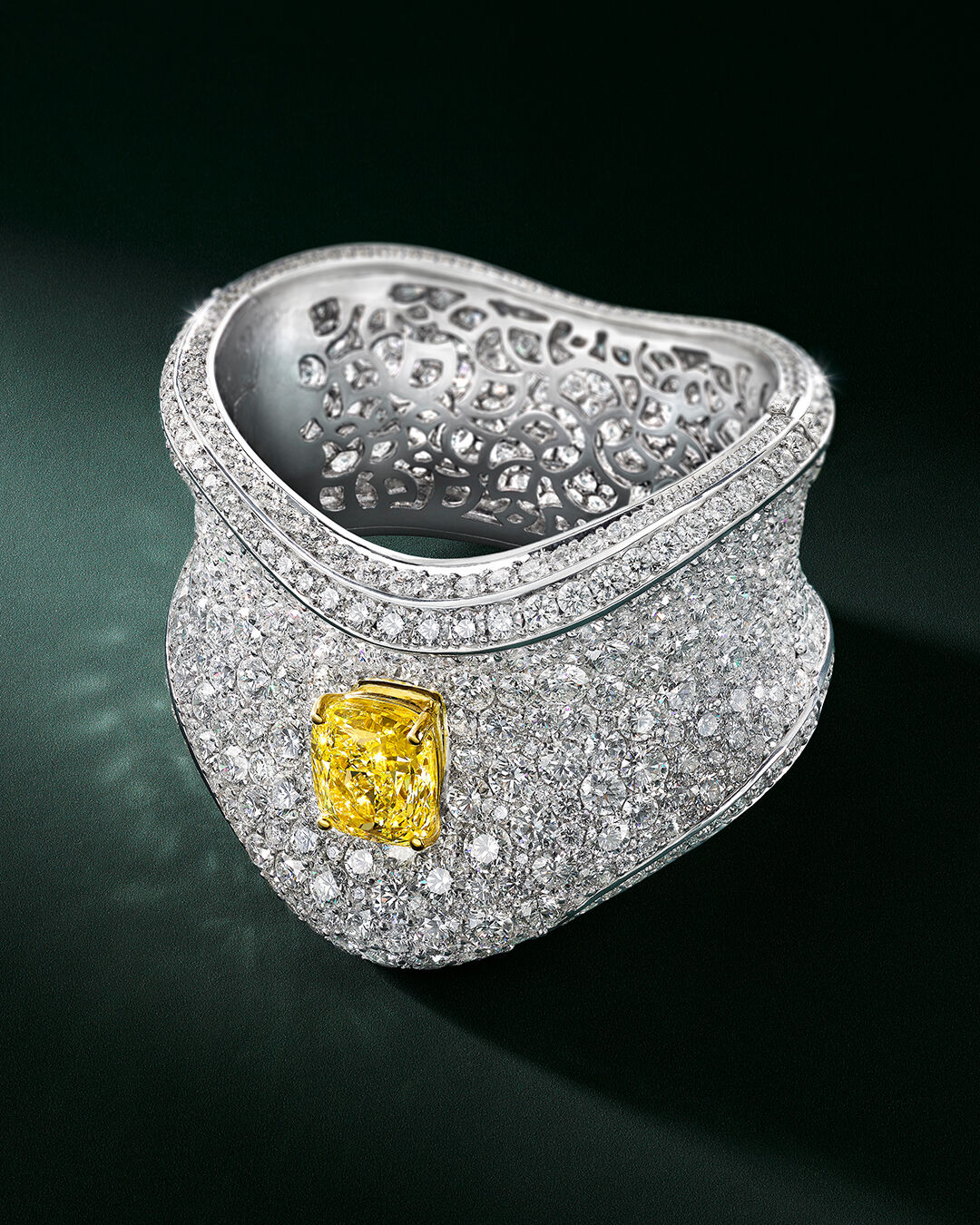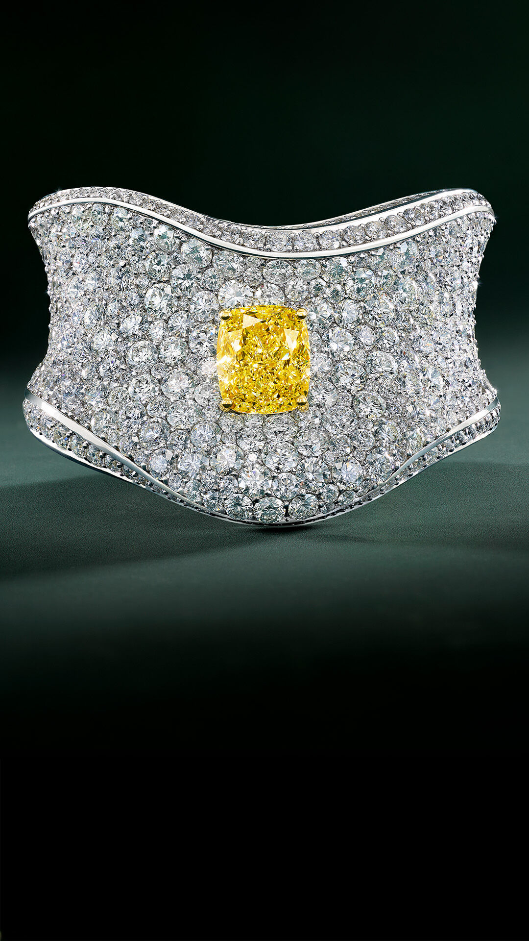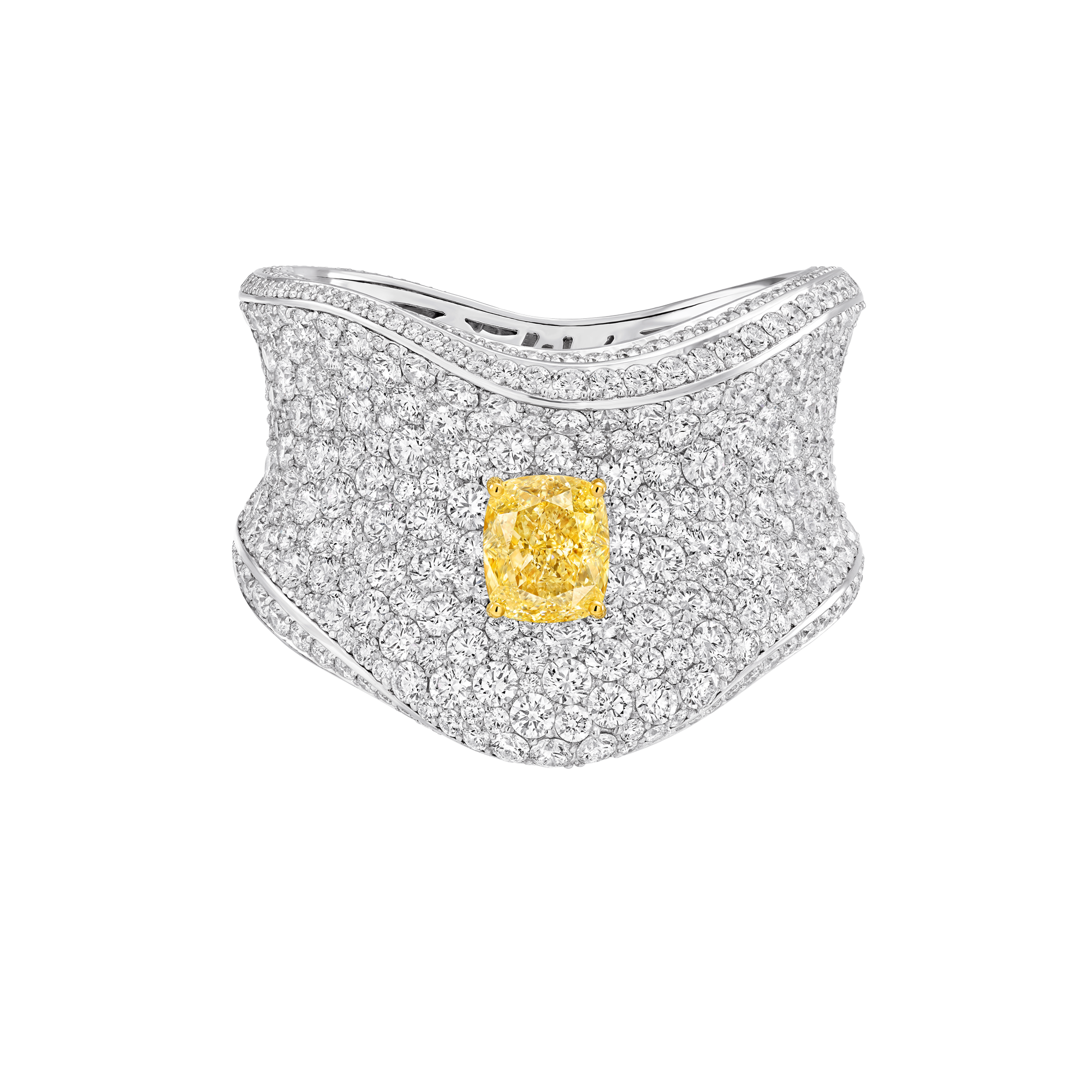 这款高级珠宝杰作以一颗重18.29克拉的枕形切割浓彩黄钻为中心,悬于总重107.50克拉的密镶钻石之上。手镯采用起伏有致的雕塑感设计,上下边缘镶嵌璀璨密镶钻石,勾勒出流畅的轮廓,瑰丽不凡。
