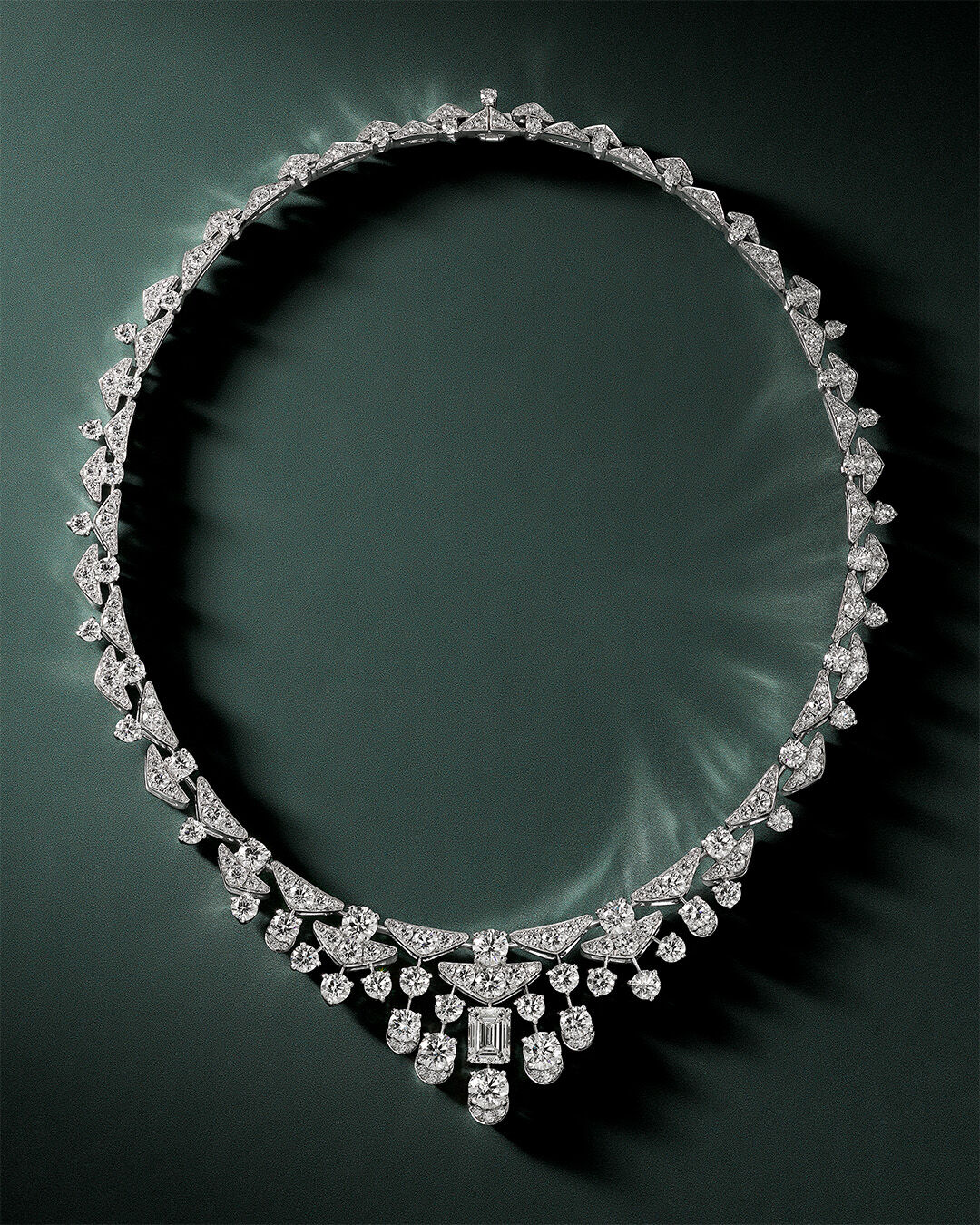圆形明亮式切割钻石沿着三角形设计流泻而下,为经典流苏项链增添现代典雅韵味。项链中央更镶嵌一颗瑰丽的2.50克拉祖母绿形切割美钻,成为优雅夺目的焦点。