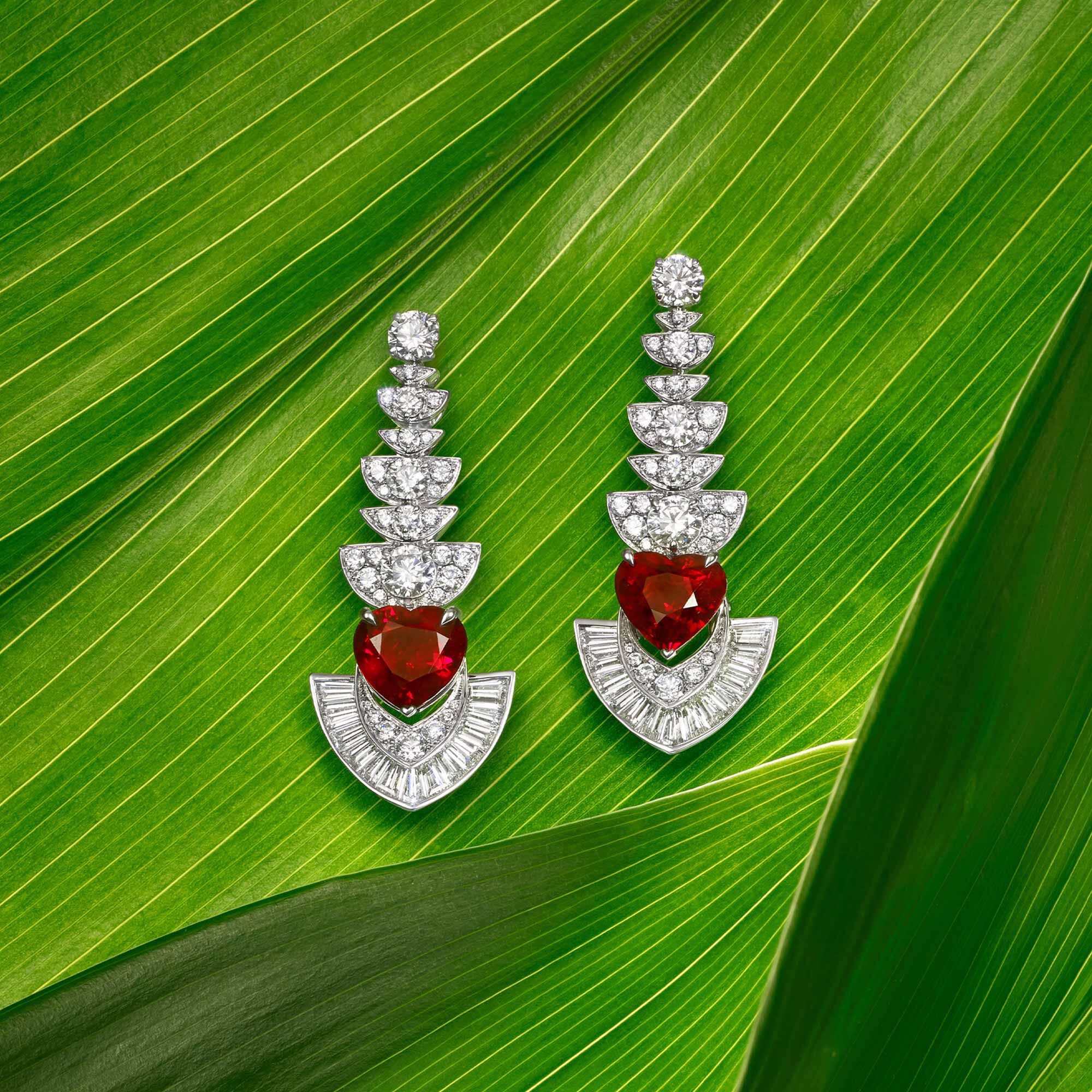 这款高级珠宝项链和耳环结合臻美宝石与现代设计,以立体灵动的特别切割钻石映衬深邃艳丽的红宝石,使中央光芒璀璨的设计元素成为焦点所在。