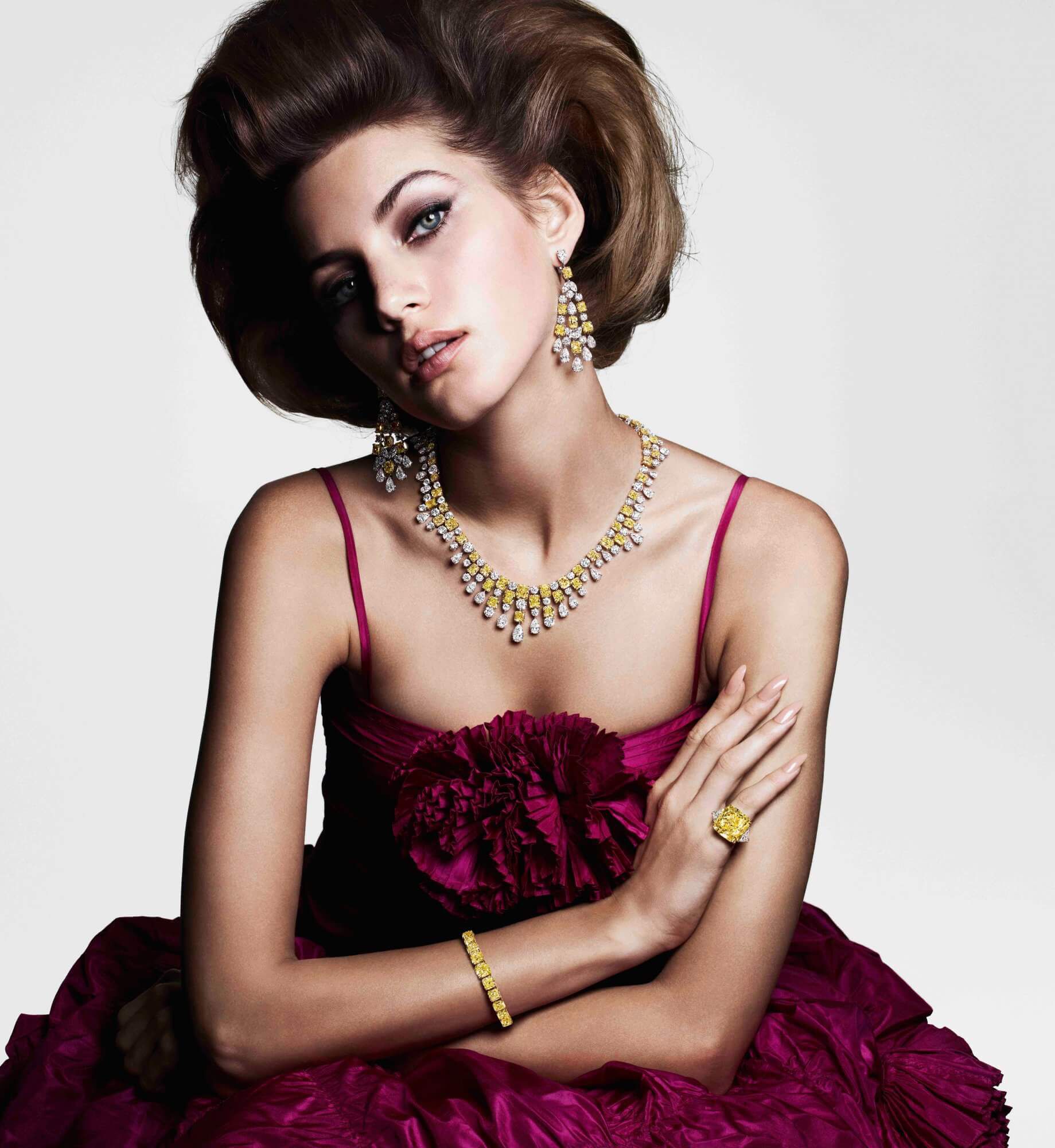 钻石耳环,镶嵌两颗各重逾11.50克拉枕形切割彩黄钻(41.03克拉);黄钻和白钻项链(96.96克拉);40.32克拉雷地恩形切割浓彩黄钻戒指;23.20克拉D色内无瑕马眼形钻石戒指