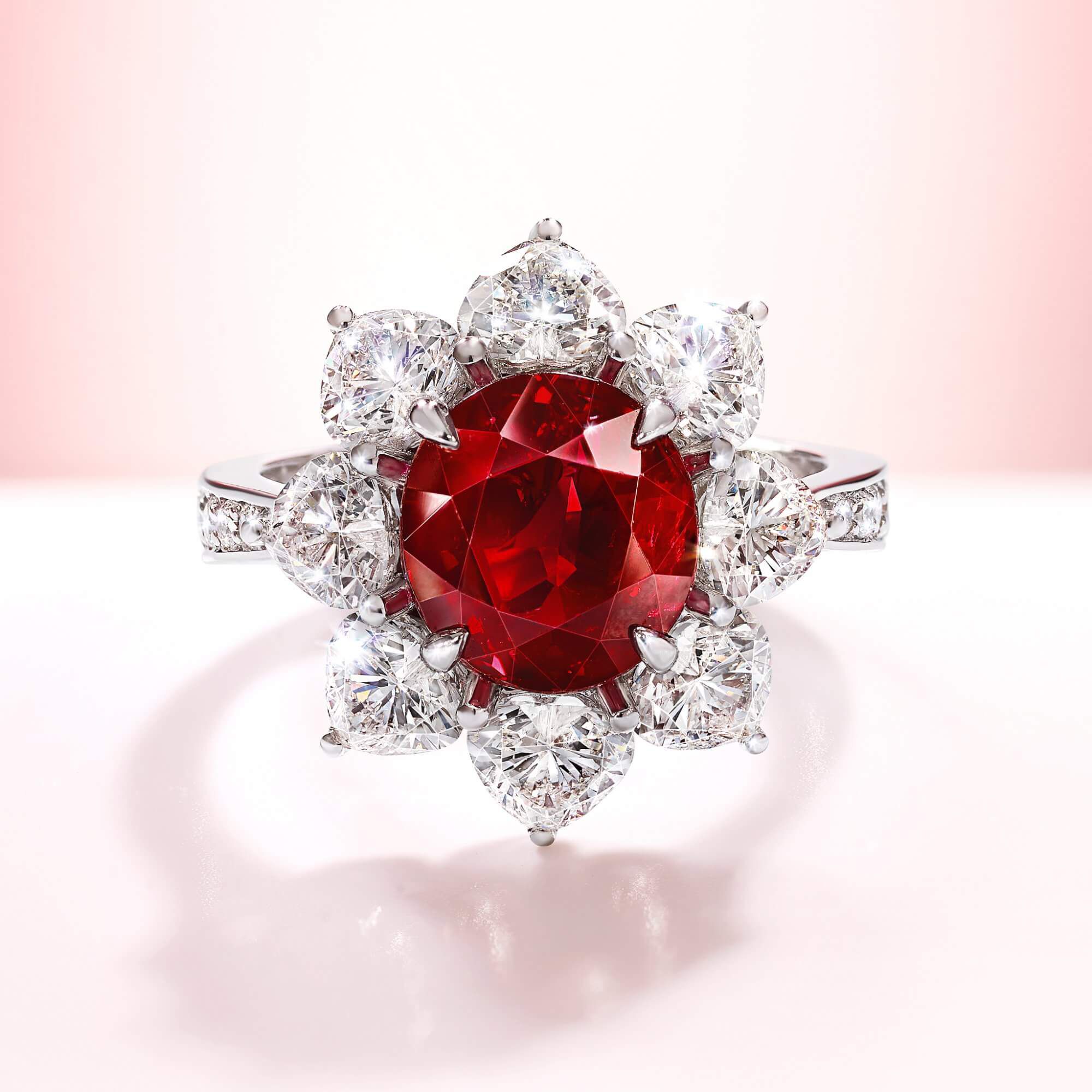 取材自娇柔花朵的戒指镶嵌一颗夺目迷人的4克拉缅甸红宝石,当地出产的红宝石素有宝石之王的美誉,而这颗呈现顶级鸽血红色泽的红宝石,更教人趋之若鹜。