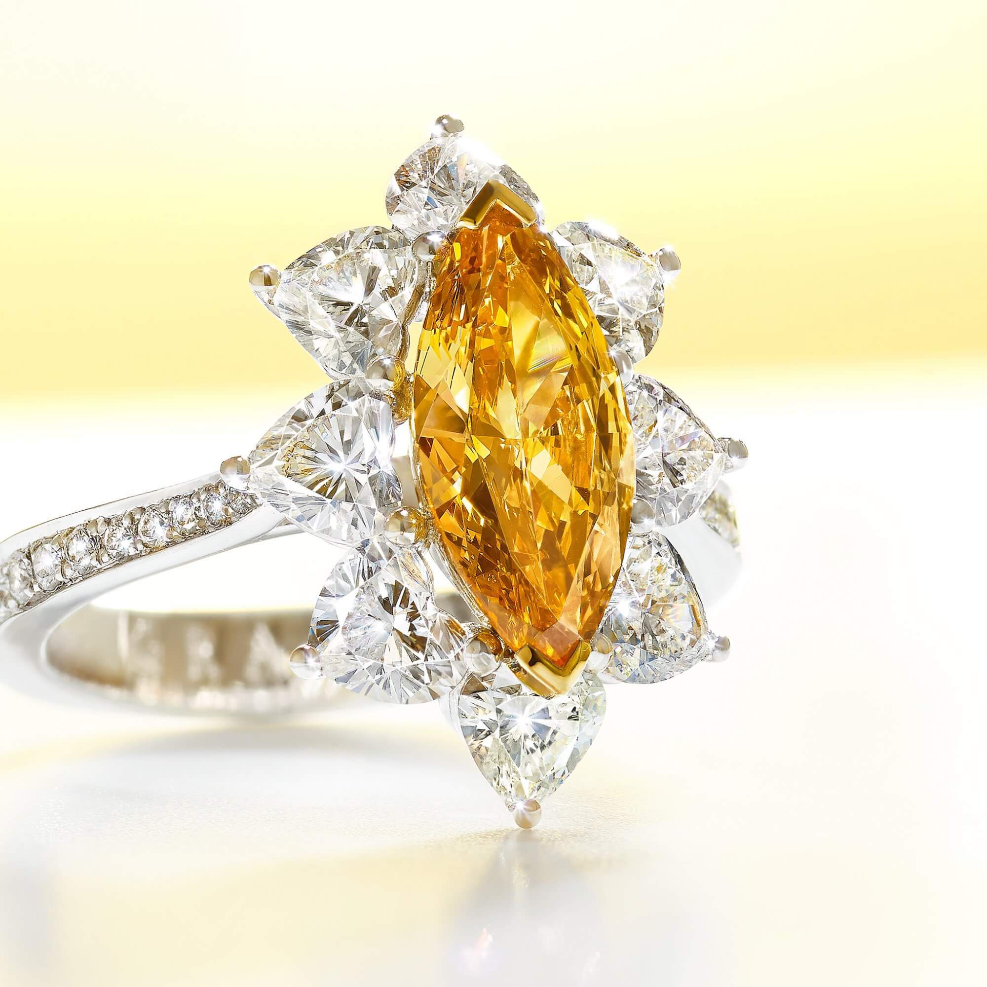 这颗马眼形艳彩黄橙钻绽放如艳阳的夺目色调,珍罕不凡,配以唯美的椭圆形线条,使迷人色泽完美升华。