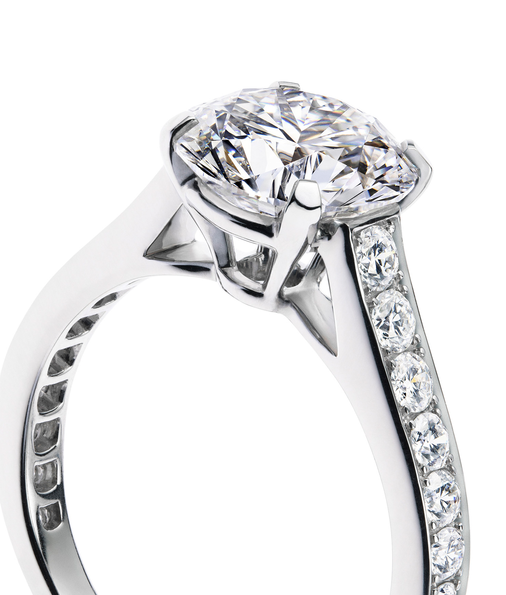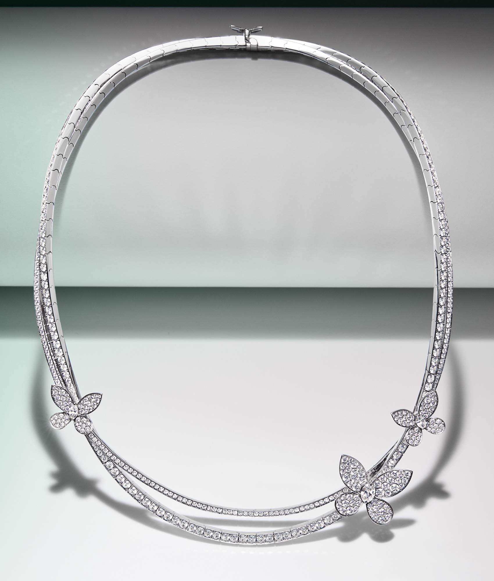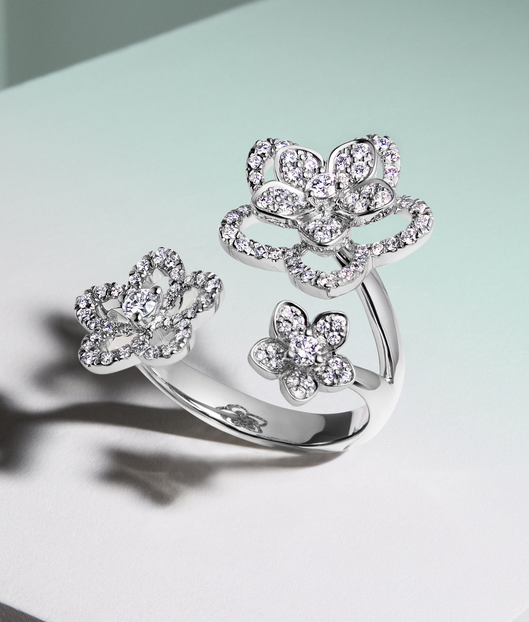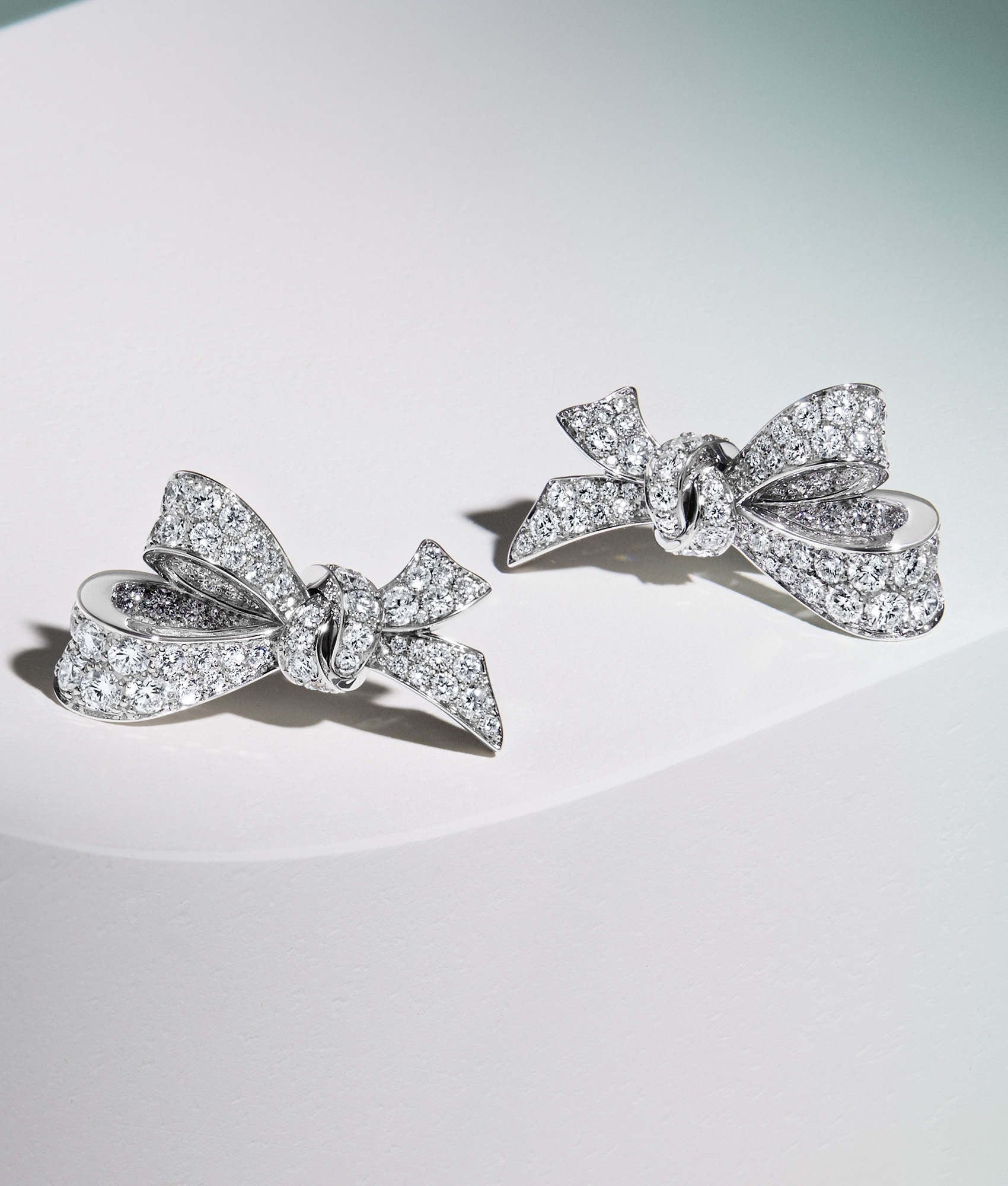 以白金制成的Tilda’s Bow双结钻石戒指以圆形钻石和梯形钻石,为经典的蝴蝶结注入新意,巧妙捕捉轻盈飘逸的缎带在巧手中化作精致蝴蝶结的美丽过程。Tilda's Bow系列包含闪烁的钻石蝴蝶结吊坠、耳钉和钻石戒指,以及瑰丽夺目的高级珠宝杰作。迷人的Tilda's Bow圆形钻石和隐形镶嵌梯形钻石戒指,钻石共重约3.60克拉。